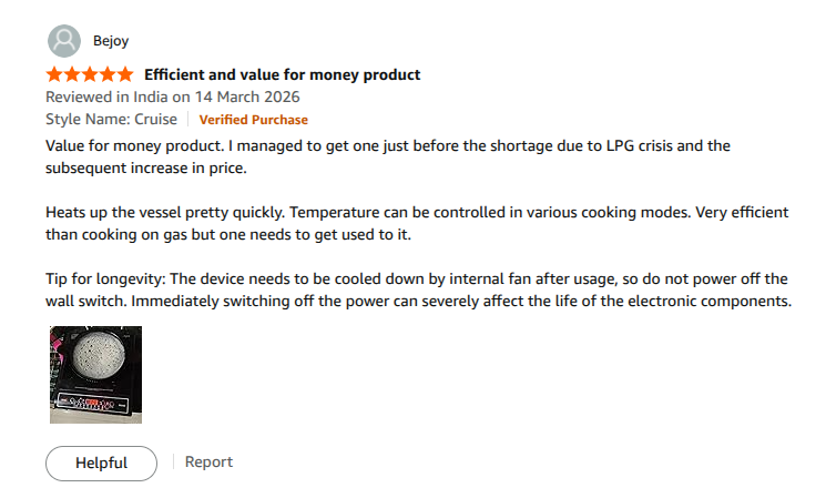 Induction Stove comes with 93-percent energy saving technology;Safety Standards: Cruise Induction Stove will start working only when the Induction base Cookware is kept on the top.